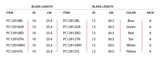 ColorCode handles correspond to their specific food group to avoid cross- contamination: use blue for cooked foods, green for fruits and vegetables, red for meat, tan for fish and seafood, white for dairy products, and yellow for poultry. Blades are made from rigid molybdenum stainless steel.