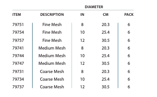 For stove top frying of single servings or small orders, as well as breading. Baskets are made of nickel-plated steel wire. Fine mesh is 1/8″ (.3 cm), medium mesh is 1/4″ (.6 cm), coarse mesh is 1/2″ (1.3 cm).