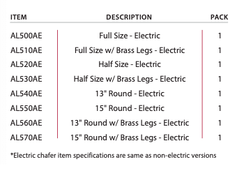 | Alegacy has broadened its selection of fine Savoir chafers with an electric conversion option. All Savoir chafers are available with electric heat components as well as the original canned heat fuel holders. Whether your buffet service is indoors or outdoors, on the patio or veranda, the Savoir line now meets all your heating needs. |