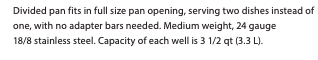 Divided pan fits in full size pan opening, serving two dishes instead of one, with no adapter bars needed. Medium weight, 24 gauge