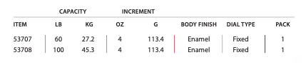 | Bigger loads require a larger surface area and wider base for balancing. The 60 or 100 lb capacity, heavy-duty portion scales have an enamel finish, a larger 10 1/2″ (26.7 cm) dial face, shatterproof lens, and temperature compensated mechanism. Platform is 13 x 13″ (33 x 33 cm) with a base measuring 14 3/4 x 10 x 14 1/4″ (37.5 x 25.4 x 36.2 cm). |