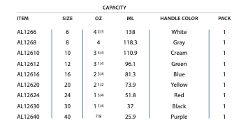 Sizes are indicated by handle color and stamped on the bowl knife blade for easy portion control. Disher is stainless steel with all metal parts and meets U.S. government standards. Individually boxed.