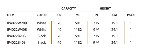 Porcelain looking pitchers are available in white or black. Tea/Decaf/Regular tab indicators are included.