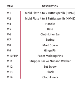 The body is polished, die-cast aluminum. Holds up to 100 sheets and the mold and knockout discs are interchangeable. Parts List for HM45 & HM69