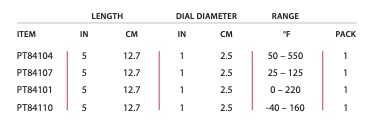 304 stainless steel case, bezel and pointed stem. Available in a variety of temperature ranges. Accuracy of +/- 1°. Includes storage case with pocket clip. Individually boxed. NSF listed. Not for oven use.