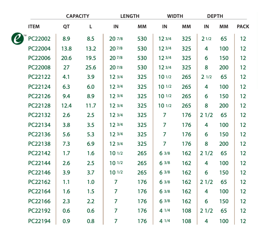 | Provides an alternate use to standard stainless steel steam table pans. Polycarbonate food pans are durable and withstand from -40°F to 210°F (-40°C to 99°C). They do not react with foods therefore minimizing food acid and oil reactions. Clear pans are marked with capacity measurements, diswasher safe, and stackable. NSF listed. |