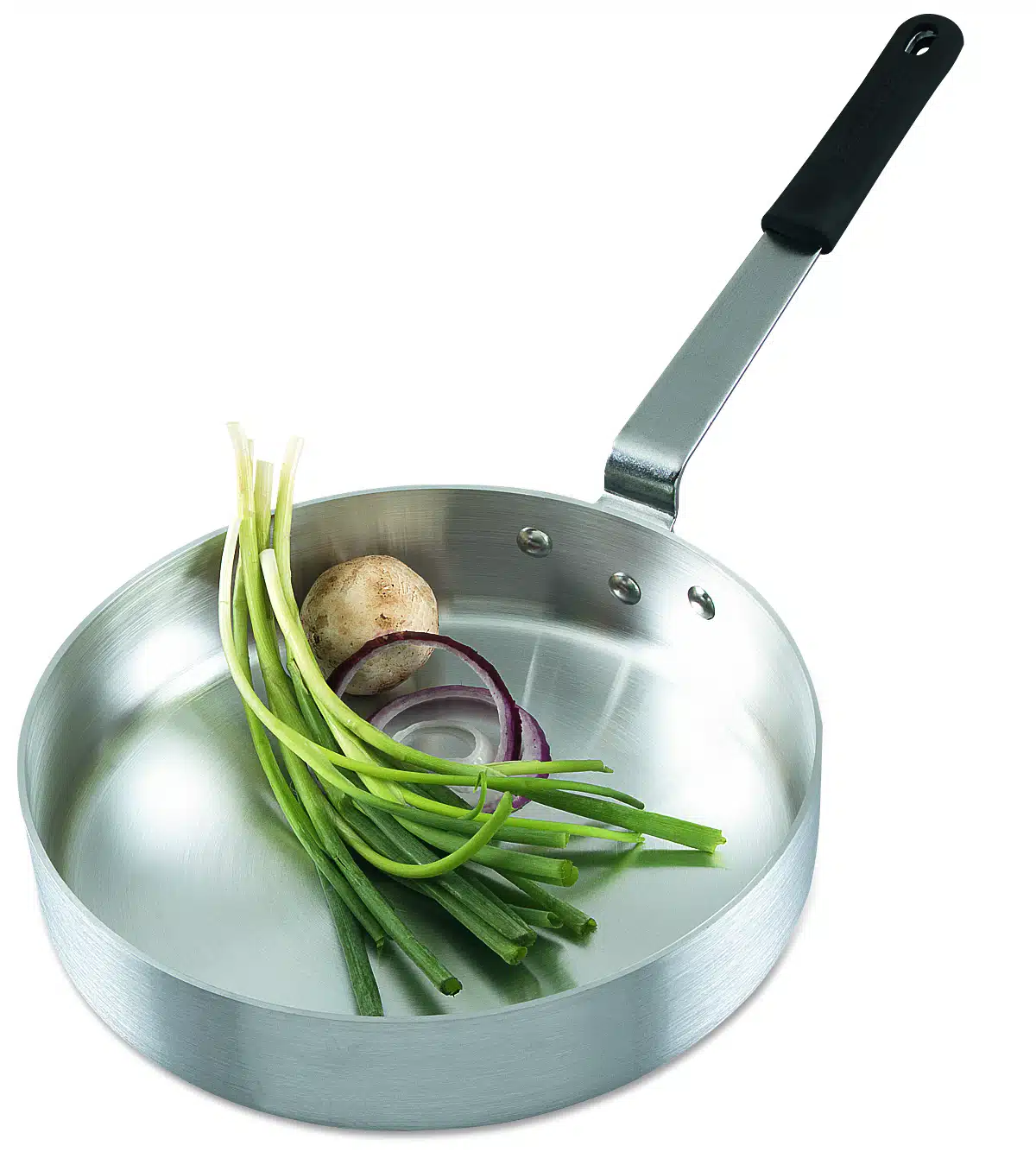 Professional chefs know the value of a well-designed sauté pan. Ours feature heavy gauge aluminum and flat bottoms to ensure even heat distribution, while the rounded corners and large, heavy, steel handles make them easy to work with. Three heavy aluminum rivets securely attach the handle, which has an eye for hanging and an EagleGripTM insulating grip for enhanced heat protection and slippage prevention. Available in three nesting sizes.