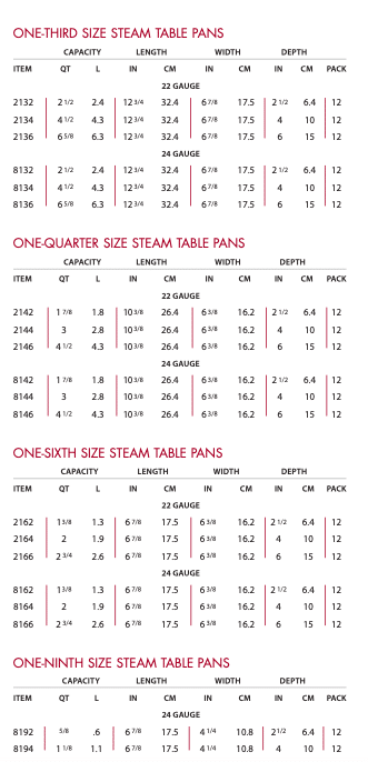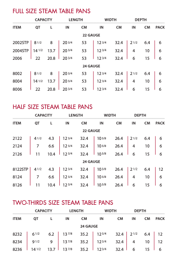 | These 18/8 stainless steel steam table pans are tight-fitting, so steam can’t escape, lengthening safe holding times. Their reinforced edges prevent the corners from bending, they fit better in the well, and can easily be moved from freezer to oven without re-panning. Available in 22 and 24 gauge stainless steel. A variety of accessories and covers are also available. Alegacy steam table pans are NSF listed. |