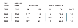 Includes pan hooks and a flat-bottom handle, enabling hands-free use. Re-tinned with lacquered wood handles and outer reinforcing mesh. Available in fine or medium mesh.