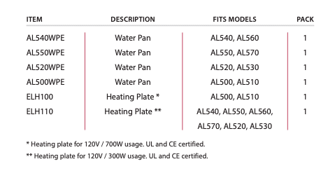 Electric unit attaches to water pans listed. Water pans may also be used with non-electric heating source.